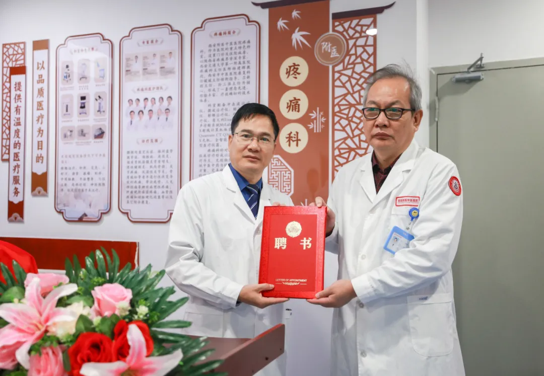 刘锐院长在致辞中深切地说:“疼痛科的牌子已经做好了,但这只是一个开始。我们要把这块牌子打造成有力量、有温度、有疗效的品牌,为更多百姓解除疼痛的困扰。今天,我们邀请交大一附院疼痛科杨建辉教授作为首席专家兼名誉主任,希望在他的带领下,疼痛科能够持续发展壮大,为更多的患者解除身心疾苦。”致辞结束后,刘院长邀请杨教授上台,为杨建辉教授郑重颁发了聘书,并一同合影留念,记录下这一重要而有纪念意义的瞬间。